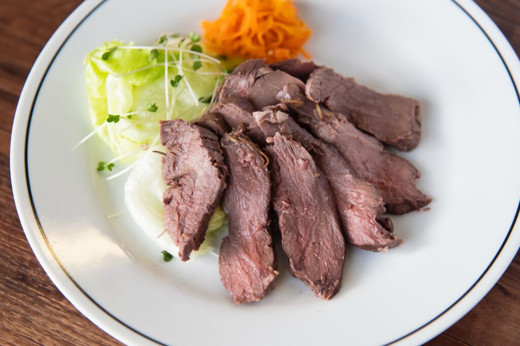 このたび、北海道日高地方で捕獲されたエゾ鹿の熟成モモ肉を使用した低温調理の新商品を発売します!湯煎するだけで、しっとり柔らかく、鹿肉本来の旨味を楽しめる一品です。